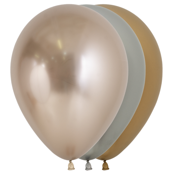 Bio Luftballon 30cm: 25 Stück in Chromglanz Mischung: 909 chromglanz rosa, 912 chromglanz pink, 915 chromglanz rot, 931 chromglanz grün, 940 chromglanz blau, 951 chromglanz violett, 968 chromglanz rosegold, 970 chromglanz gold, 981 chromglanz silber.
