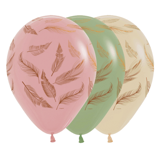Bio Luftballon ø30cm: 25 Stück in den Farben Altrosa 010, Eucalyptus 027, Weisser Sand 071 bunt gemischt, bedruckt mit Federn.