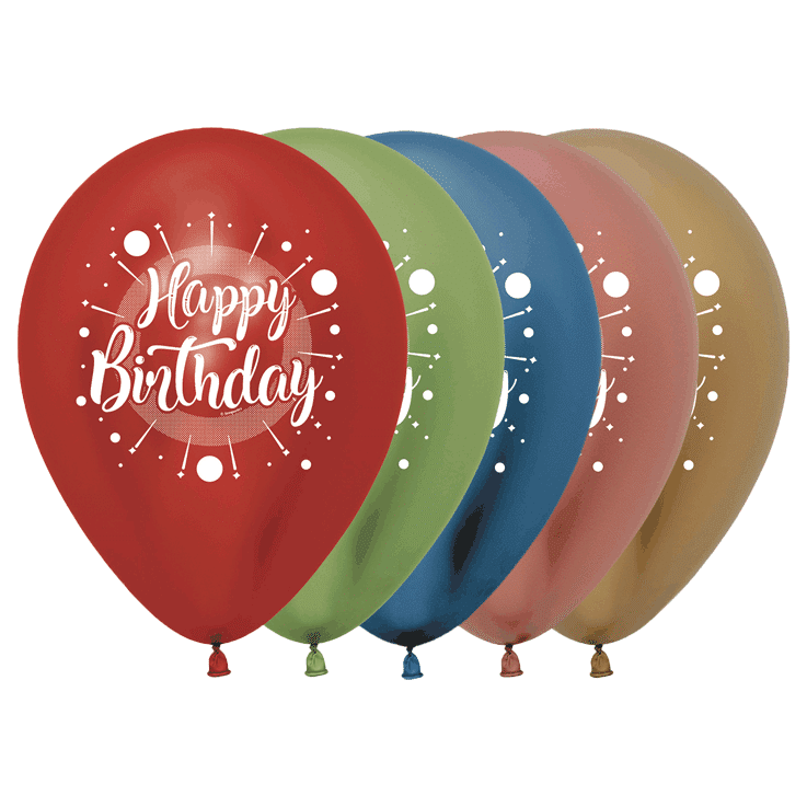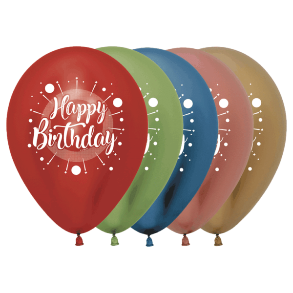 Bio Luftballons 30cm: 25 Stück in Chromglanz Rot 915, Hellgrün 931, Blau 940, Rosegold 968, Gold 970, bedruckt mit Happy Birthday (2-seitig).