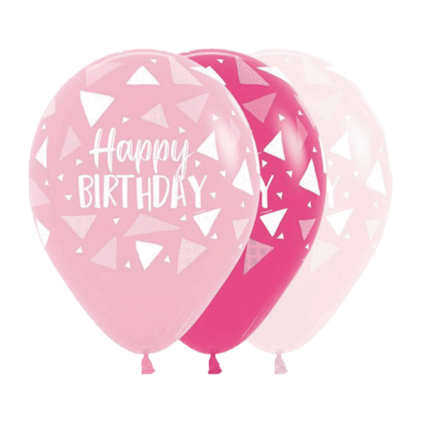Bio Luftballon ø30cm: 25 Stück in den Farben Rosa 009, Pink 012, Pastellrosa matt 609 bunt gemischt, bedruckt mit Happy Birthday und Dreiecken.