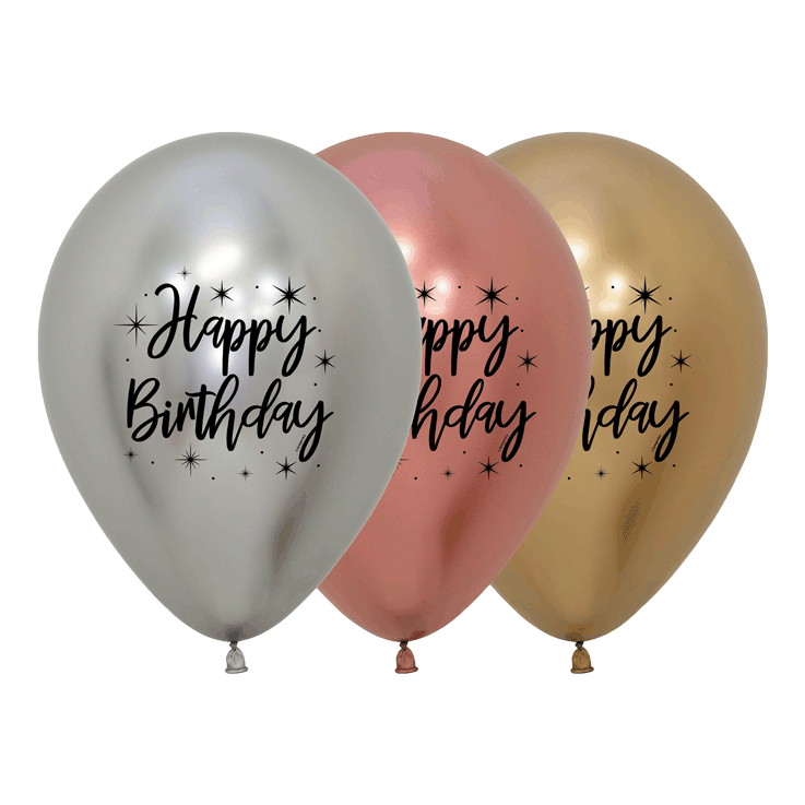 Bio Luftballon 30cm: 25 Stück in Chromglanz Rosegold 968, Gold 970, Silber 981 , bedruckt mit Happy Birthday mit Sternen (2-seitig). Er kann mit Luft oder Helium gefüllt werden. Die Tragfähigkeit der Heliumfüllung beträgt ca. 8 g, die Füllmenge ca. 13 Liter Ballongas / Helium. Mit dieser Gasfüllung kann der Luftballon im Idealfall 12 – 16 Stunden fliegen, bis ihm das Gas ausgeht. Unsere Natur-Luftballons ohne Plastik, Weichmacher oder Füllstoffe.