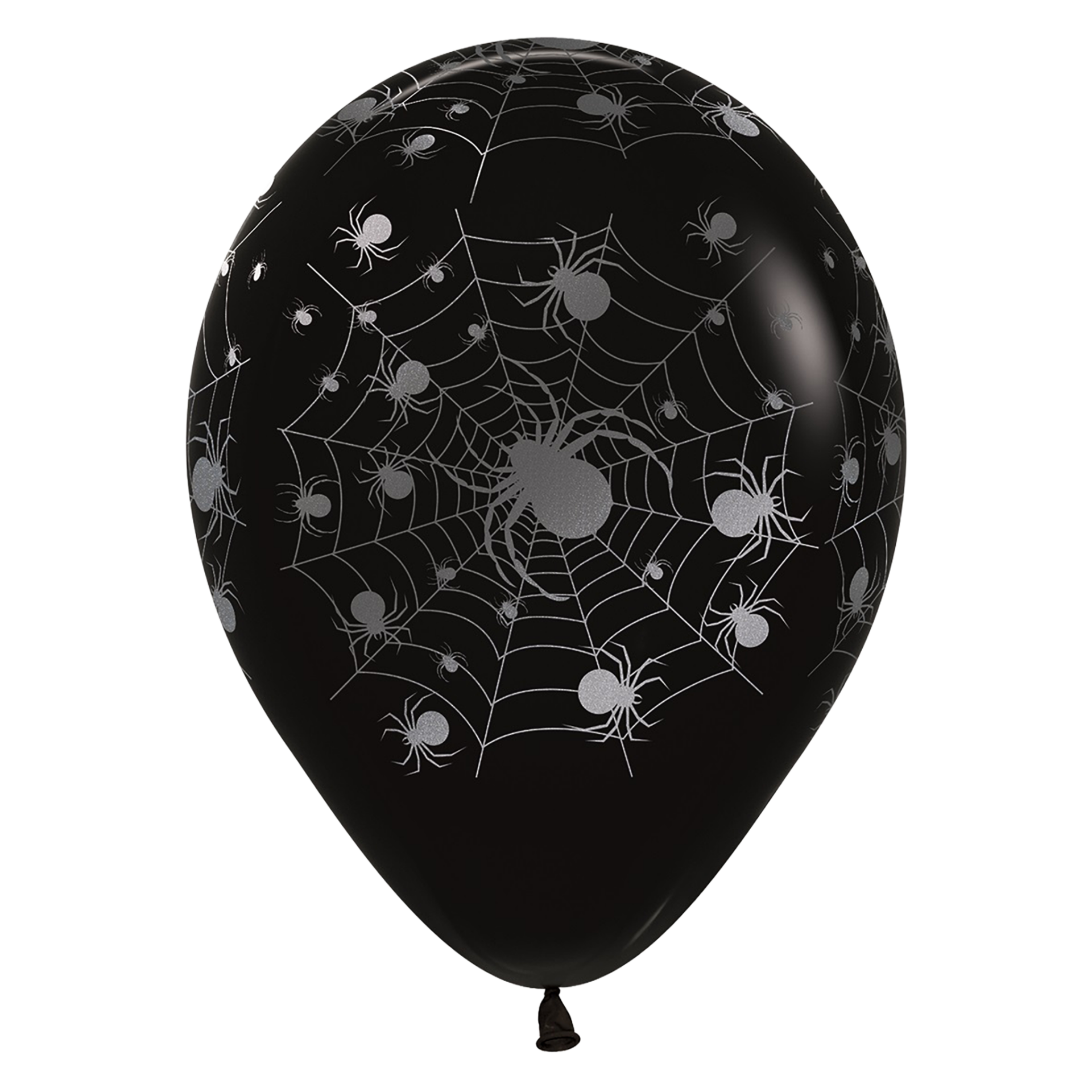 Silbrig-weiße Spinnennetze und kleine Spinnen bedecken den gesamten schwarzen Ballon. Ein großes Netz mit dicker Spinne sitzt mittig, umgeben von kleineren Netzen und krabbelnden Spinnen.