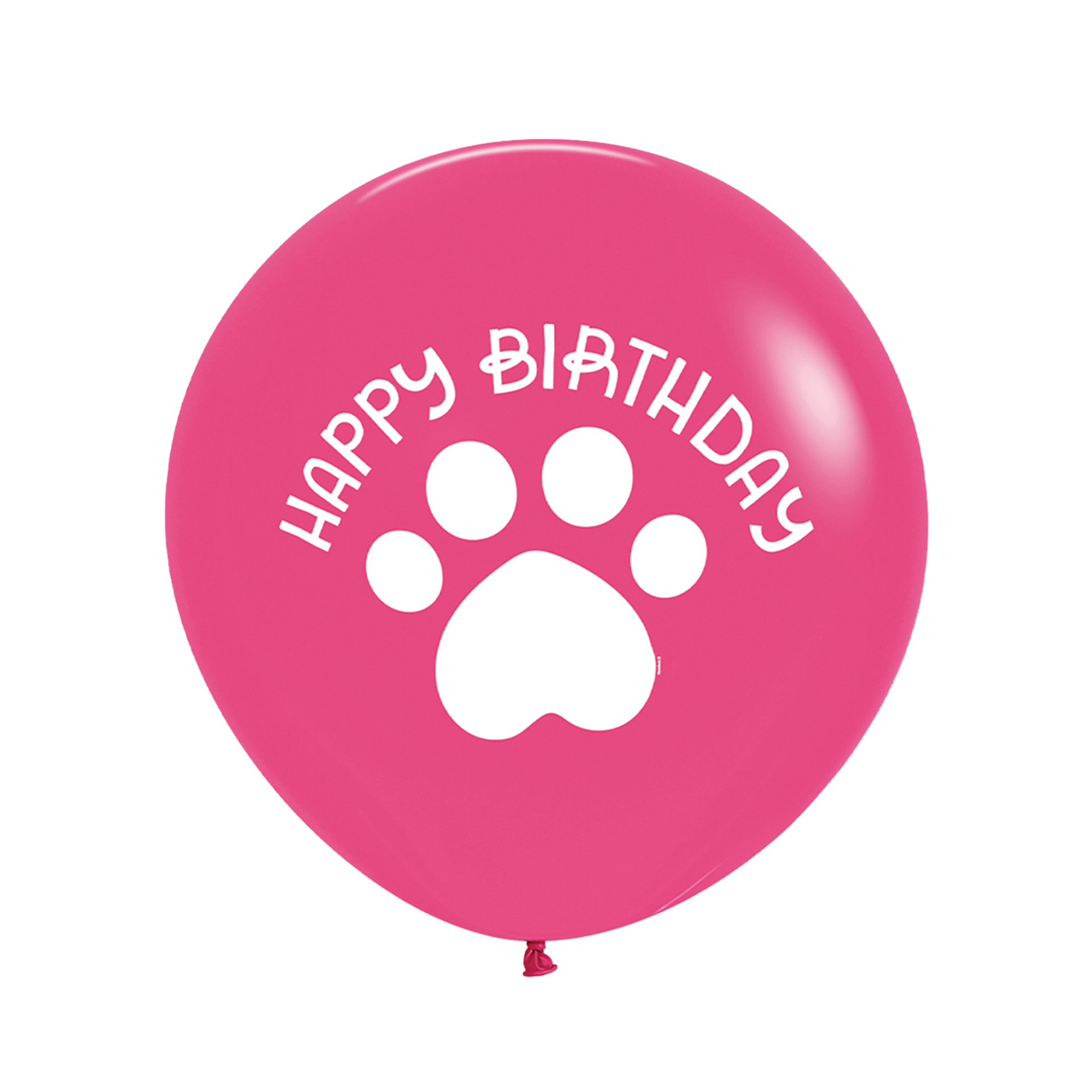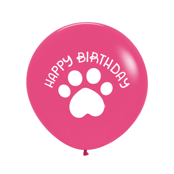 Große weiße Hundepfote mit herzförmigem Ballen mittig auf kräftig pinkfarbenem Latex. Darüber geschwungener weißer Happy-Birthday-Schriftzug im verspielten Blockbuchstaben-Stil auf dem großen 60-cm-Ballon.